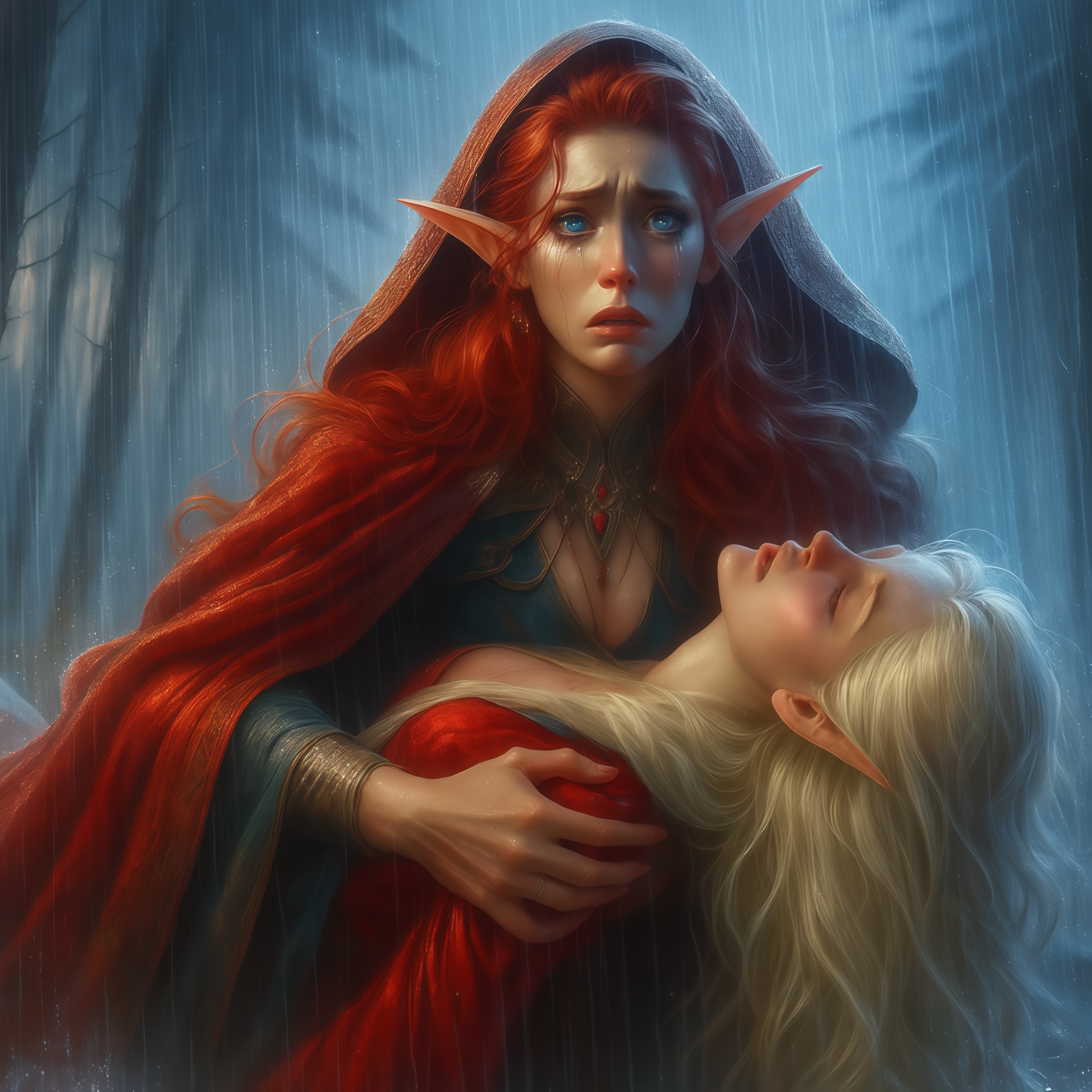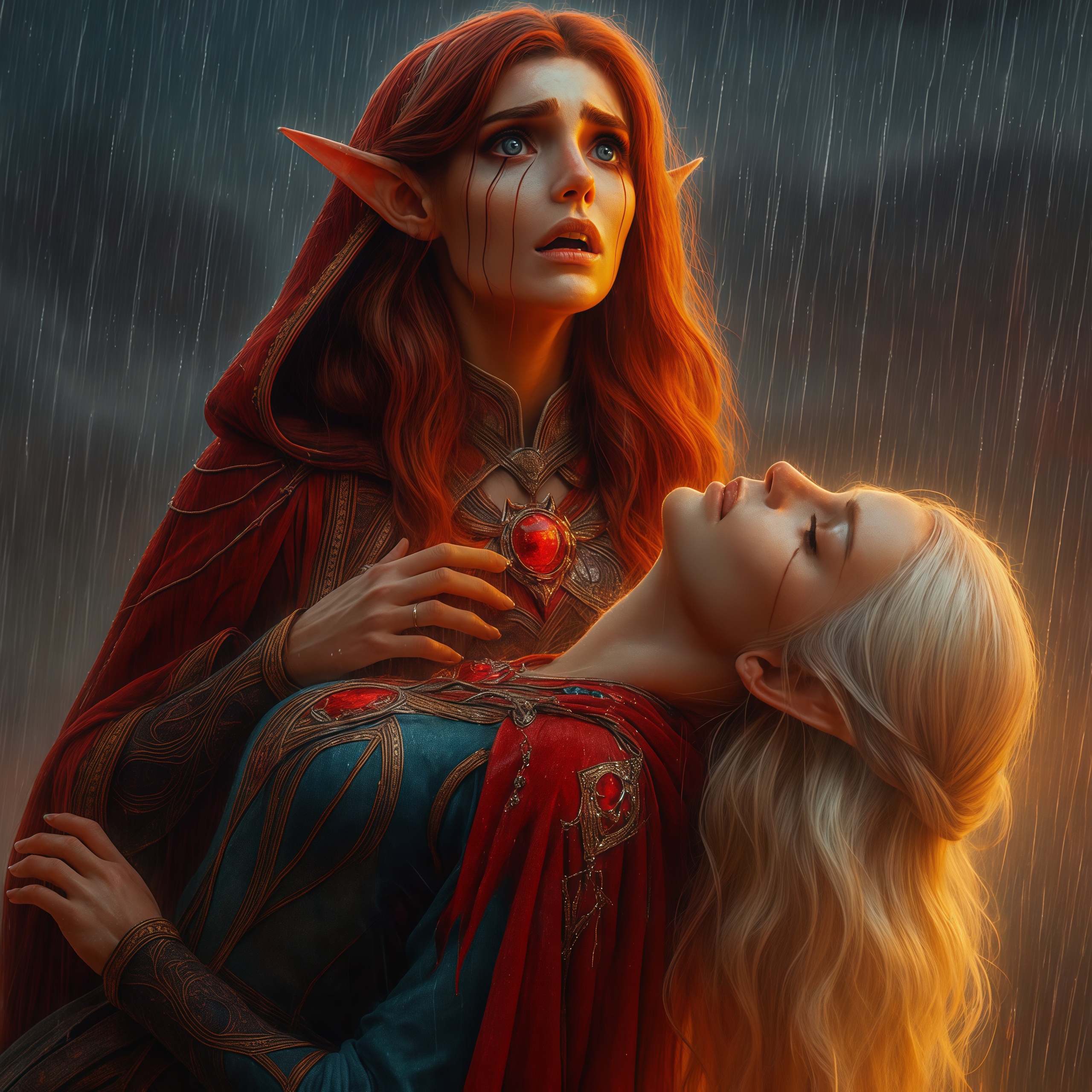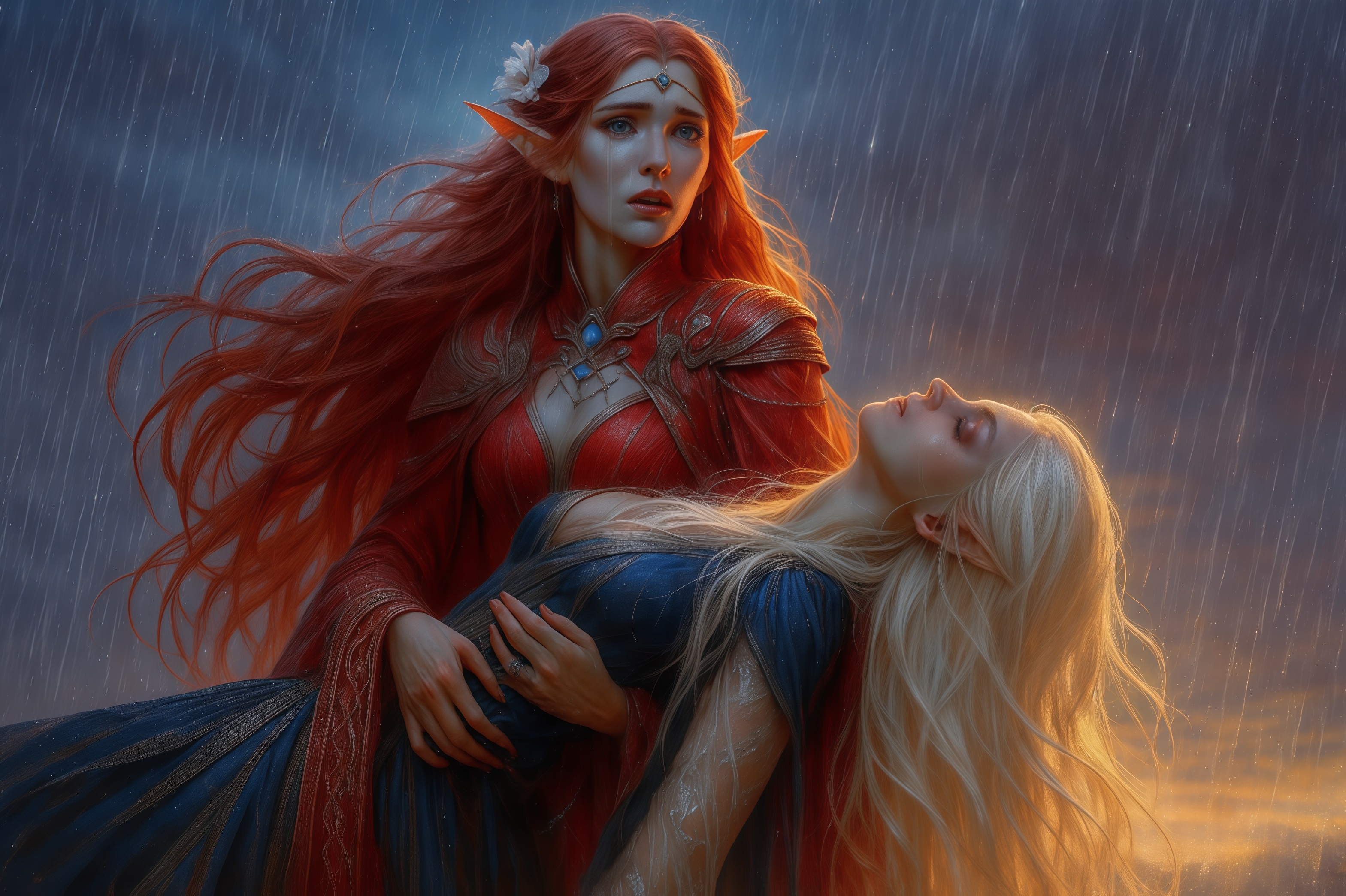 Они неохотно отступили, чтобы не получить еще больше. Валиндрея осталась одна. Она тут же упала, положив Андрамиссу к себе на колени, убрав прядь волос с ее лица, поглаживая ее. Небо затянуло тучами и начался дождь, и Валиндрея заплакала.