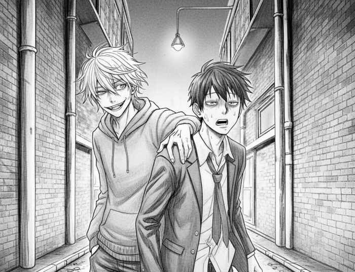 Спустя пару минут он свернул в узкий, плохо освещённый переулок между двумя старыми зданиями. Он шёл до самого конца, пока не упёрся в глухую кирпичную стену. Тупик. Он медленно развернулся, пакет с раменом всё так же небрежно висел в его руке. Навстречу ему, перекрывая выход, двигались пятеро. Они пытались выглядеть грозно: уверенные лица, расслабленные, «крутые» походки, руки в карманах. Классическое нападение толпой на одного, которое должно было вселить в жертву ужас.