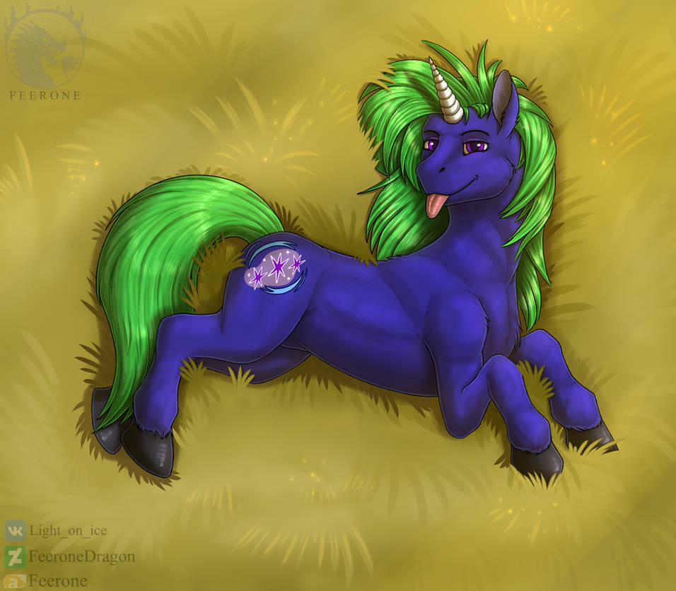 Я обратил внимание на его темно-фиолетовые глаза, что почему-то на пару секунд привлекли меня, словно заворожив, не дав мне сказать ни слова в течении нескольких мгновений. Я еле смог отвести от жеребца взгляд и ответить: