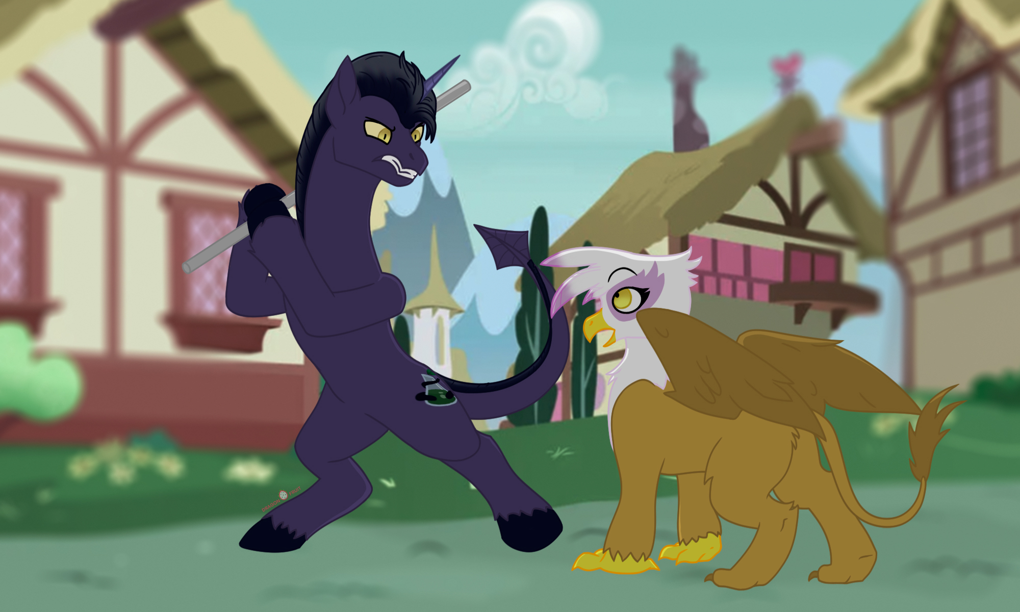 В этот момент с улицы послышался громкий рев, словно одновременно кричал лев и орел. Я, отвлёкшись от разговора, подошёл к окну и увидел, как несколько понивилльцев убегают с рынка, говоря что-то про злобного грифона.