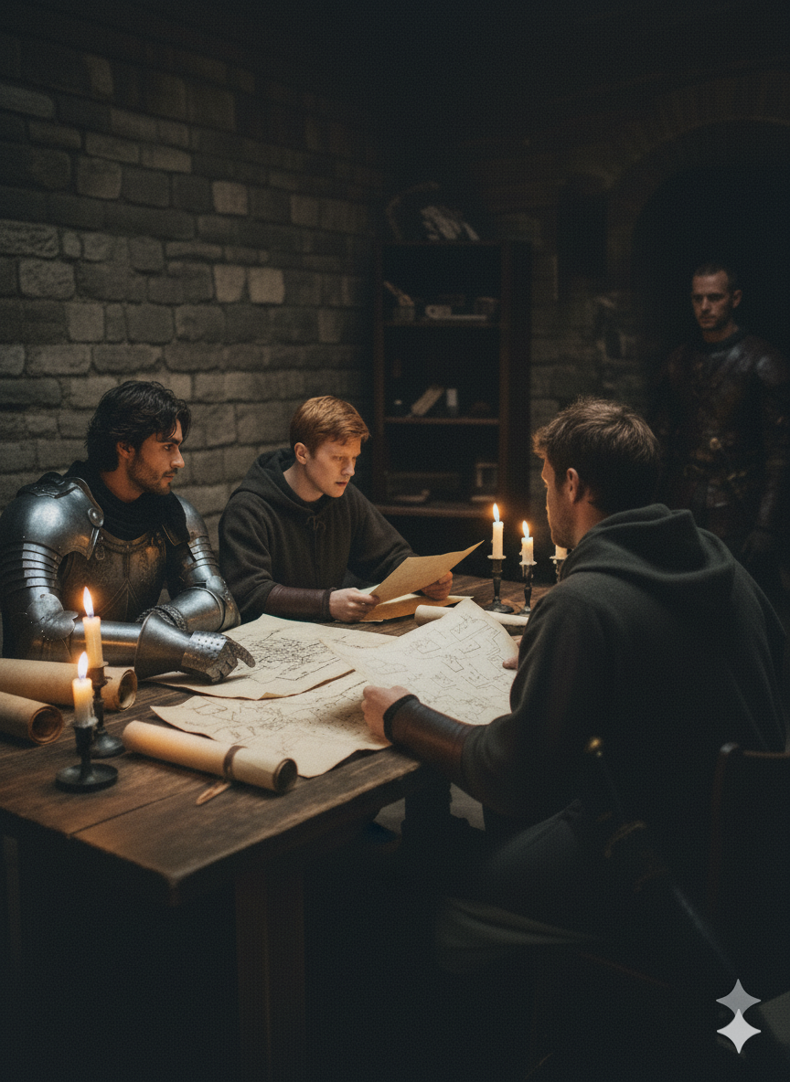 Он сидел за массивным столом, заваленным картами. Линии обороны на них были прочерчены густо, некоторые — подчёркнуты кроваво-красным. Рядом стояли Лукас, его каменная опора, и Дорик, вид которого ясно говорил, что он предпочел бы сейчас любую шлюху и бутыль вина этому совещанию. В дверях, прислонившись к косяку, стоял ещё один человек. Тонкий, как клинок, почти невидимый в тенях.